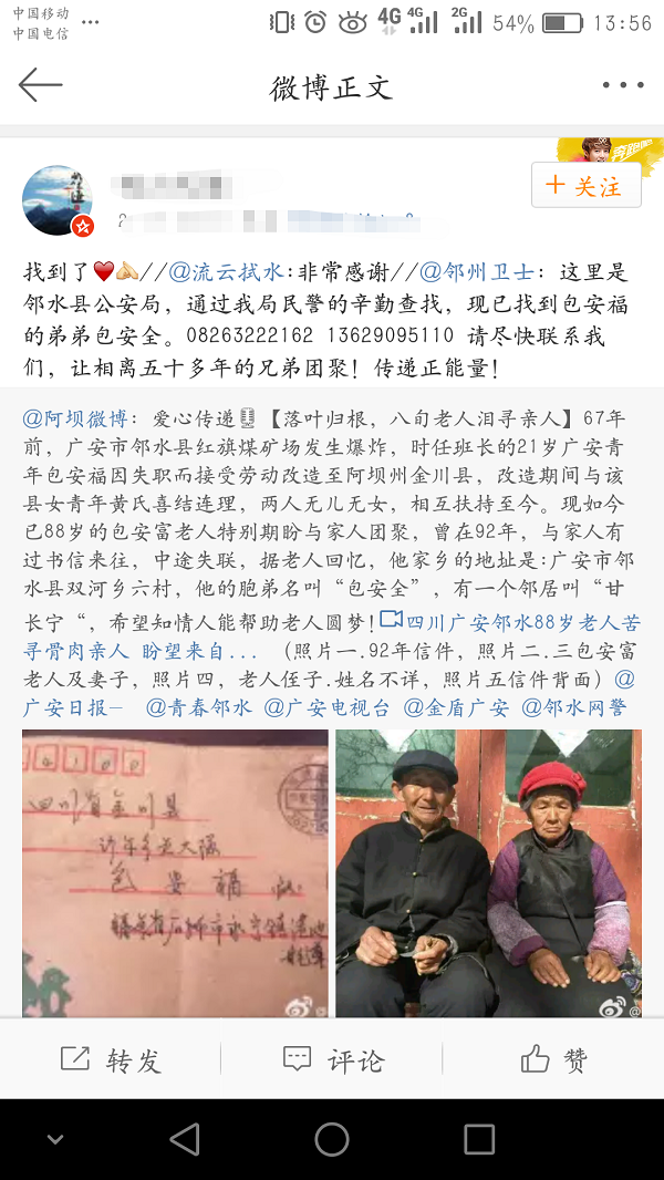 2017年2月17日上午11时许,阿坝微博发布了一条名为“落叶归根,八旬老人泪寻亲人”的微博,这条微博通过互联网传到了邻水警方的民警手中,民警根据该微博提供的信息排查走访,历时六小时终于找到了包安全,让失散六十七年的亲兄弟通过网络见了面...