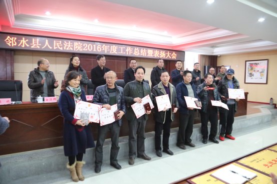 1月23日,邻水县法院召开2016年度工作总结暨表扬大会,邻水县委常委、政法委书记熊良平,邻水县人大常委会副主任蔡顺,邻水县政协副主席王德明,邻水县法院院长卿兵出席会议,邻水县法院全体干警参加会议。